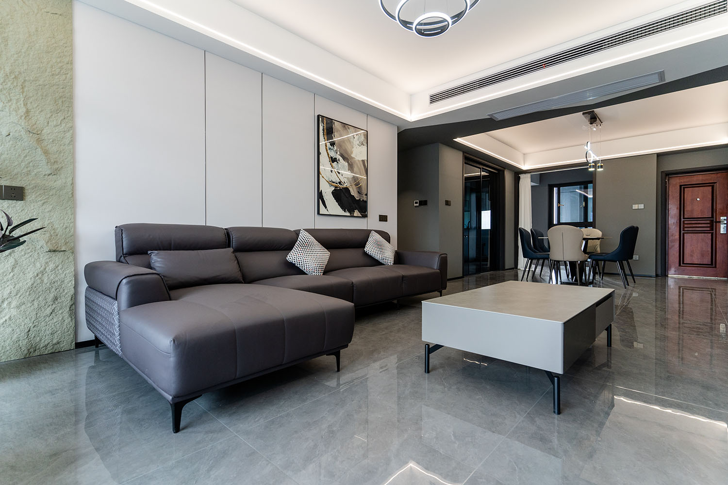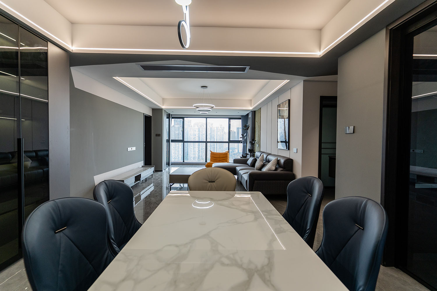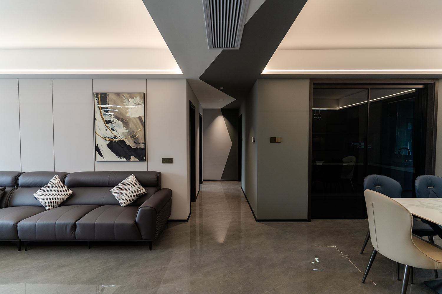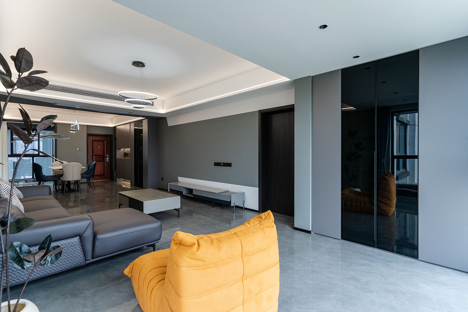 本案的核心設(shè)計(jì)理念是 “于克制中,見自由” 。旨在通過(guò)嚴(yán)謹(jǐn)?shù)臉?gòu)圖與色彩控制,展現(xiàn)一種高度理性的秩序之美。設(shè)計(jì)并非追求冰冷的極致,而是在黑白灰的框架內(nèi),通過(guò)材質(zhì)的溫度、光影的變幻與線條的韻律,注入感性的生活氣息,最終達(dá)成一種冷靜與溫暖、簡(jiǎn)約與豐富的微妙平衡,滿足都市精英對(duì)品質(zhì)與格調(diào)的雙重追求。