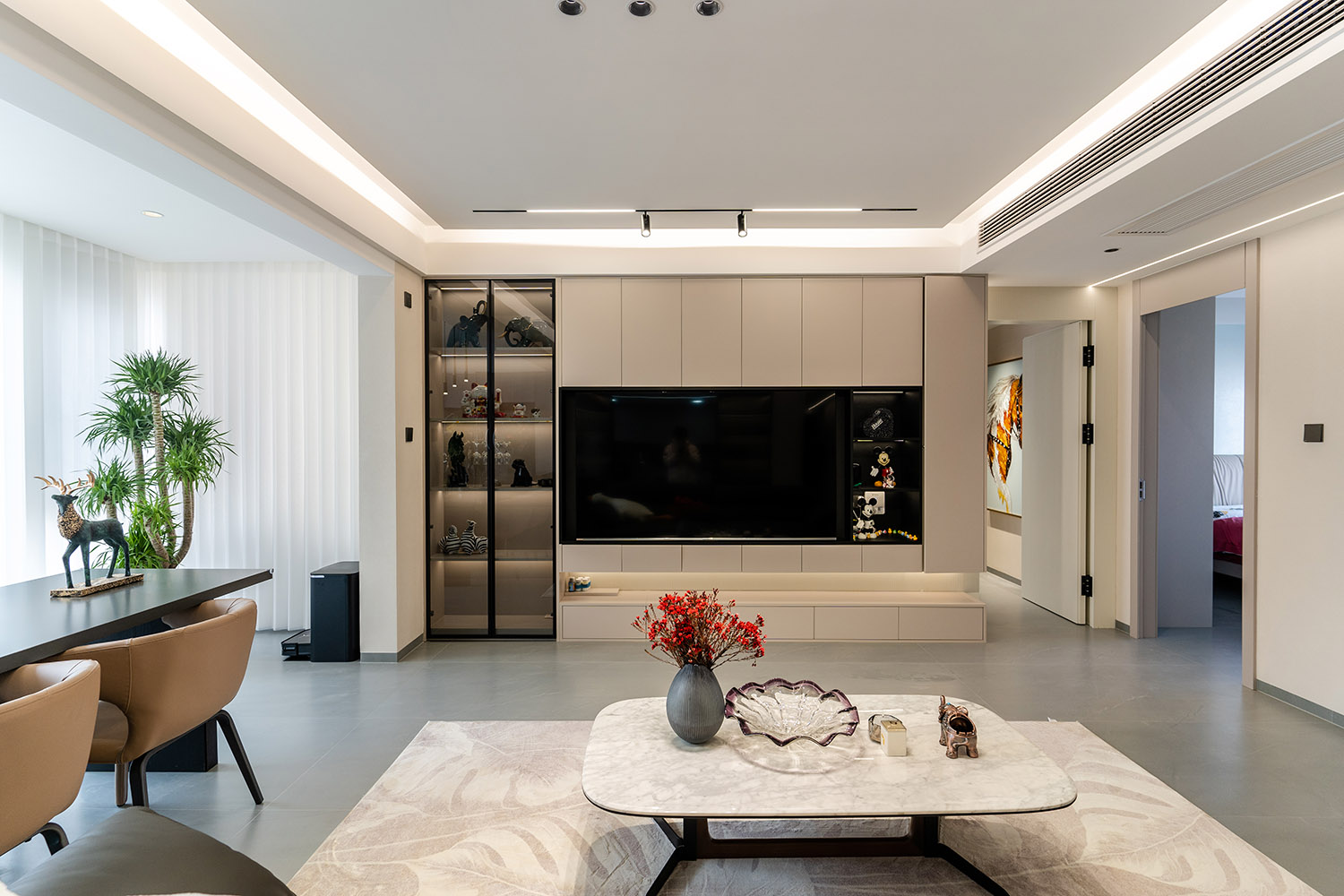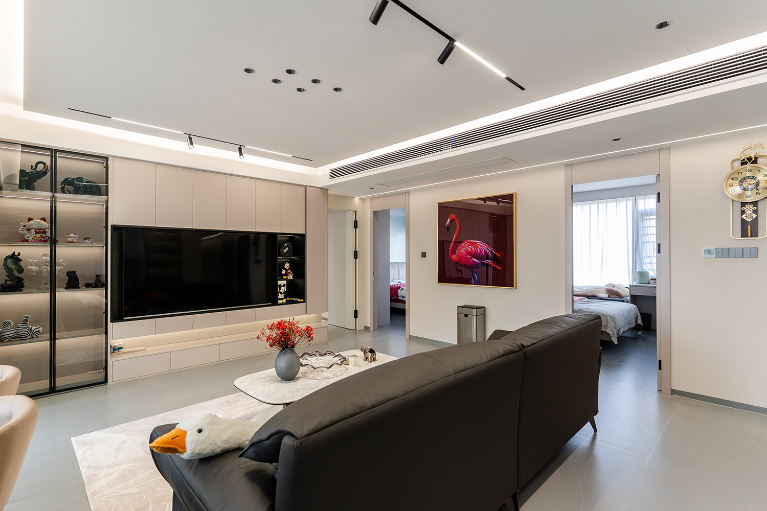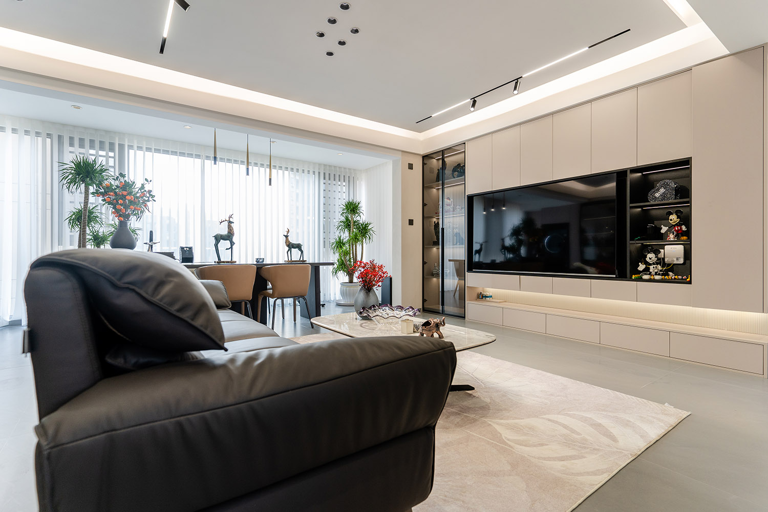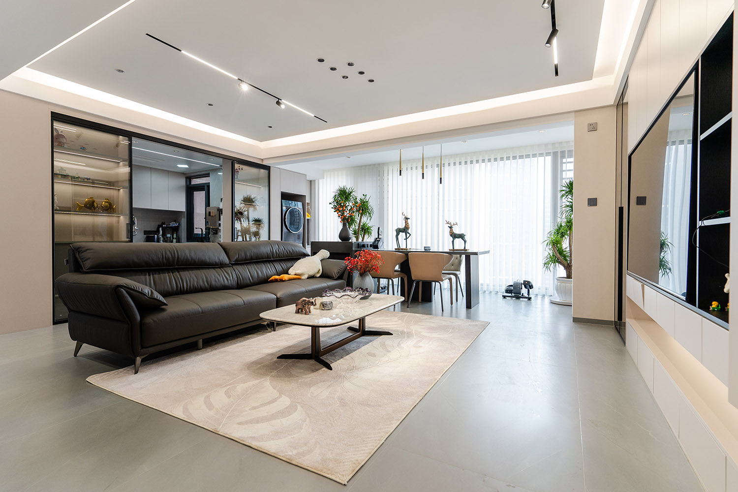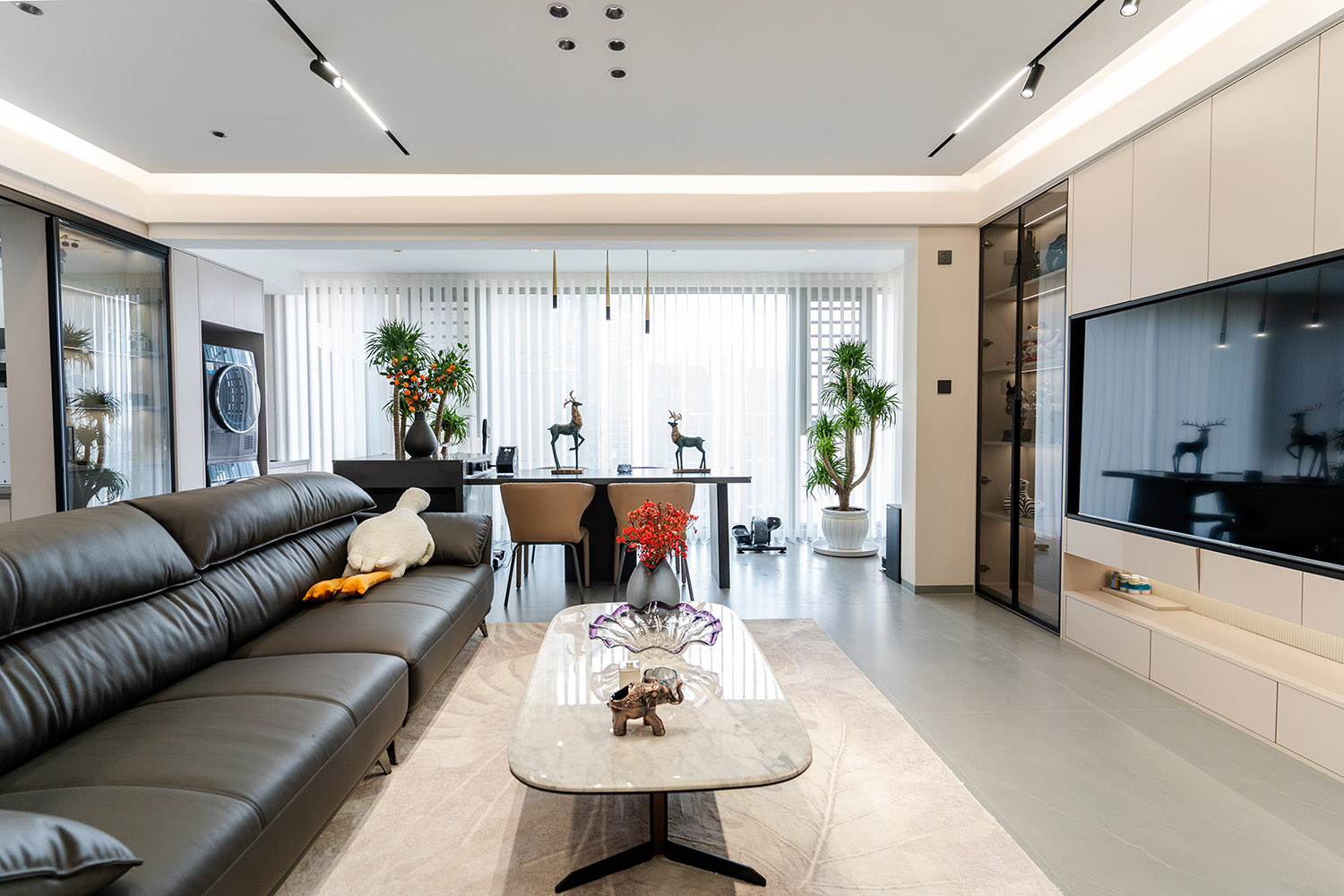 簡(jiǎn)構(gòu)生活,奢于本質(zhì) 本案的核心設(shè)計(jì)理念是 “功能顯性,裝飾隱性” 。設(shè)計(jì)追求一種“去設(shè)計(jì)師化”的純凈狀態(tài),將所有復(fù)雜的思考與工藝藏于簡(jiǎn)潔的表象之下。空間本身被視為一個(gè)功能容器與精神容器,通過(guò)極致的收納整合、無(wú)障礙的動(dòng)線規(guī)劃與柔和的感官體驗(yàn),讓居住者的生活本身成為空間最美的風(fēng)景。