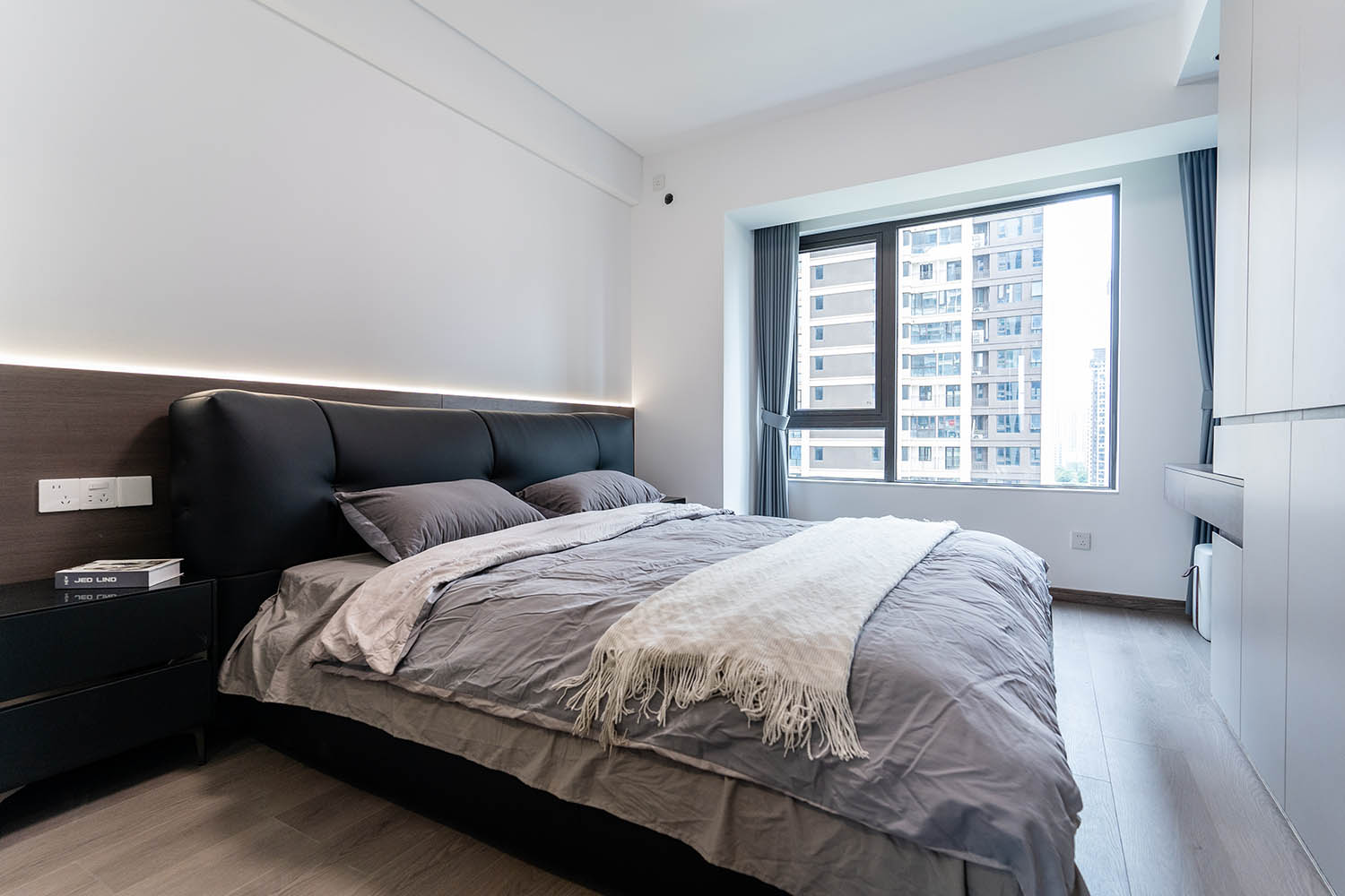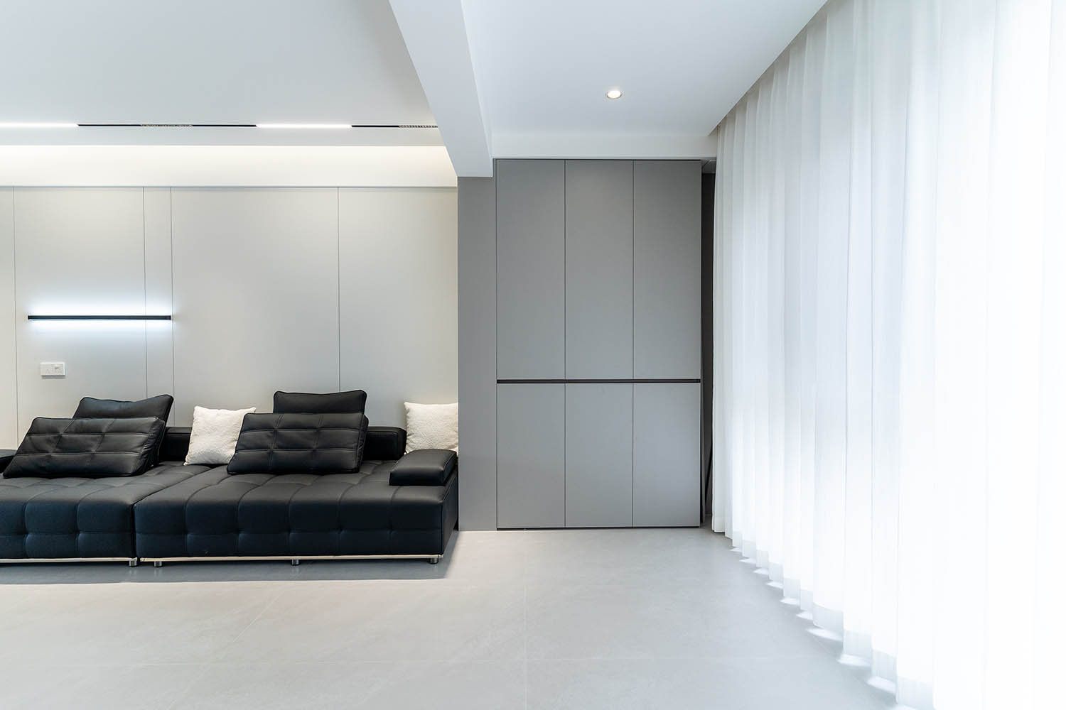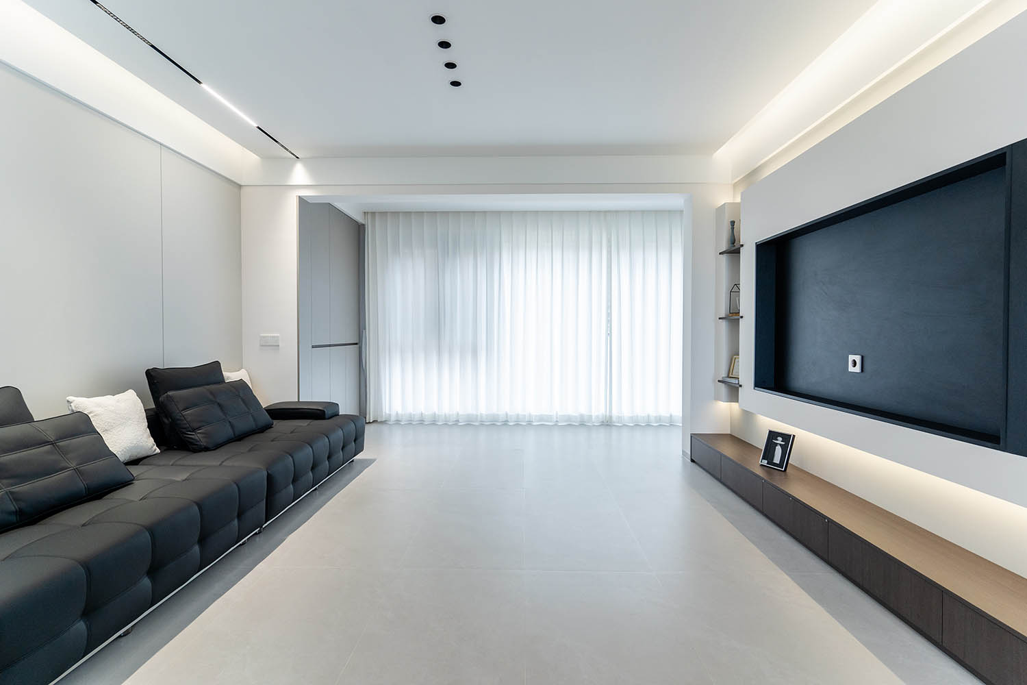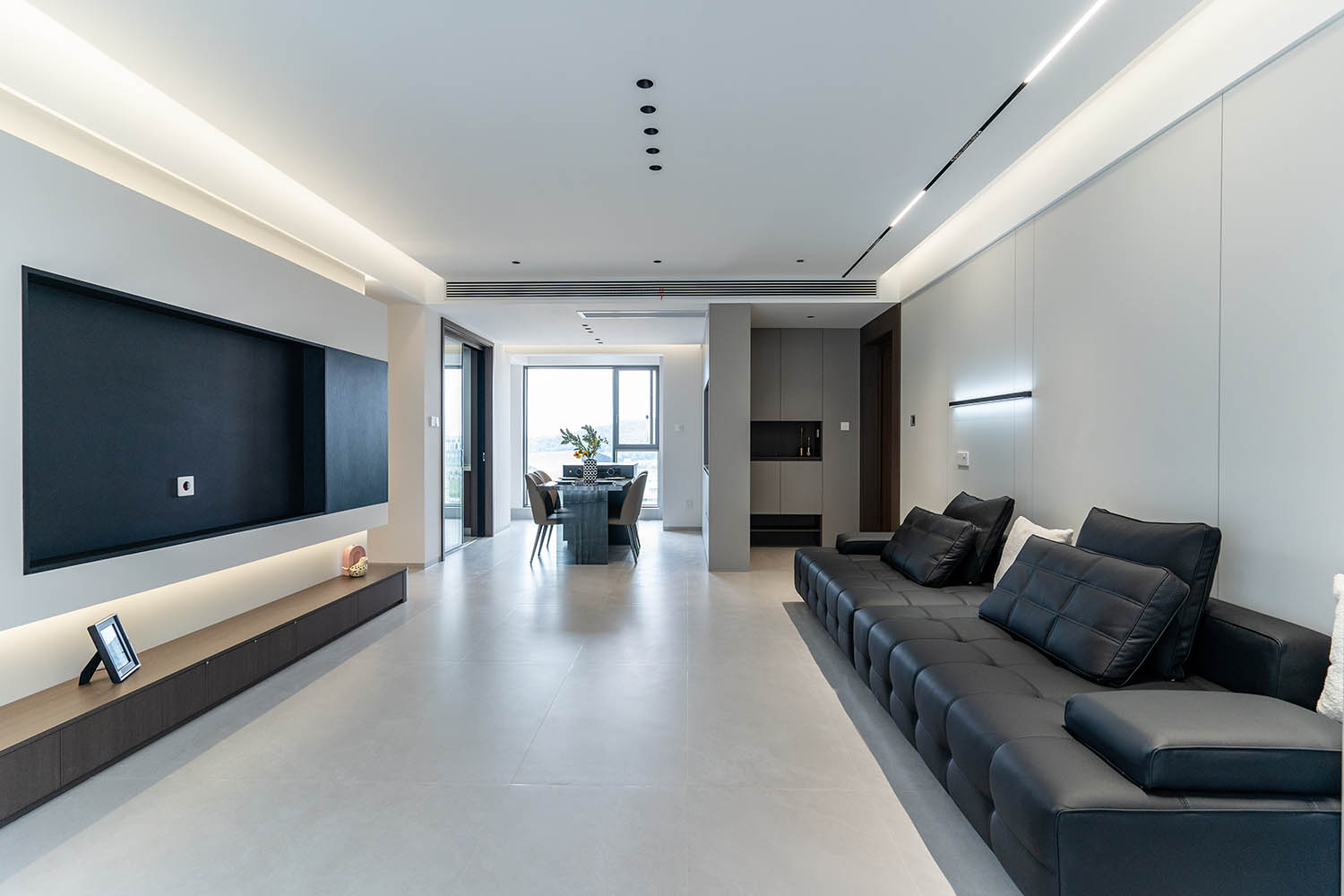 用黑、白、灰的經(jīng)典碰撞,詮釋意式極簡的「做減法的藝術(shù)」。沒有冗余裝飾,以利落線條、純粹色調(diào),讓空間回歸「實(shí)用與質(zhì)感共生」的本質(zhì),每一處都藏著 “用必要定義高級” 的設(shè)計(jì)智慧。 無主燈設(shè)計(jì) + 線性燈帶,讓光線柔和包裹空間;黑色皮質(zhì)沙發(fā)簡化形態(tài),與灰色背景墻呼應(yīng),詮釋意式「隱于簡的高級感」,舍去繁雜裝飾,還原空間本真互動場域。每一寸存在都值得被凝視,讓走過空間的人,忍不住贊嘆這份 “不動聲色的精致” 。