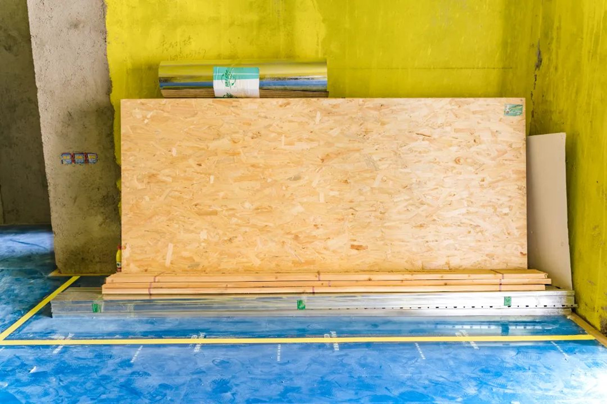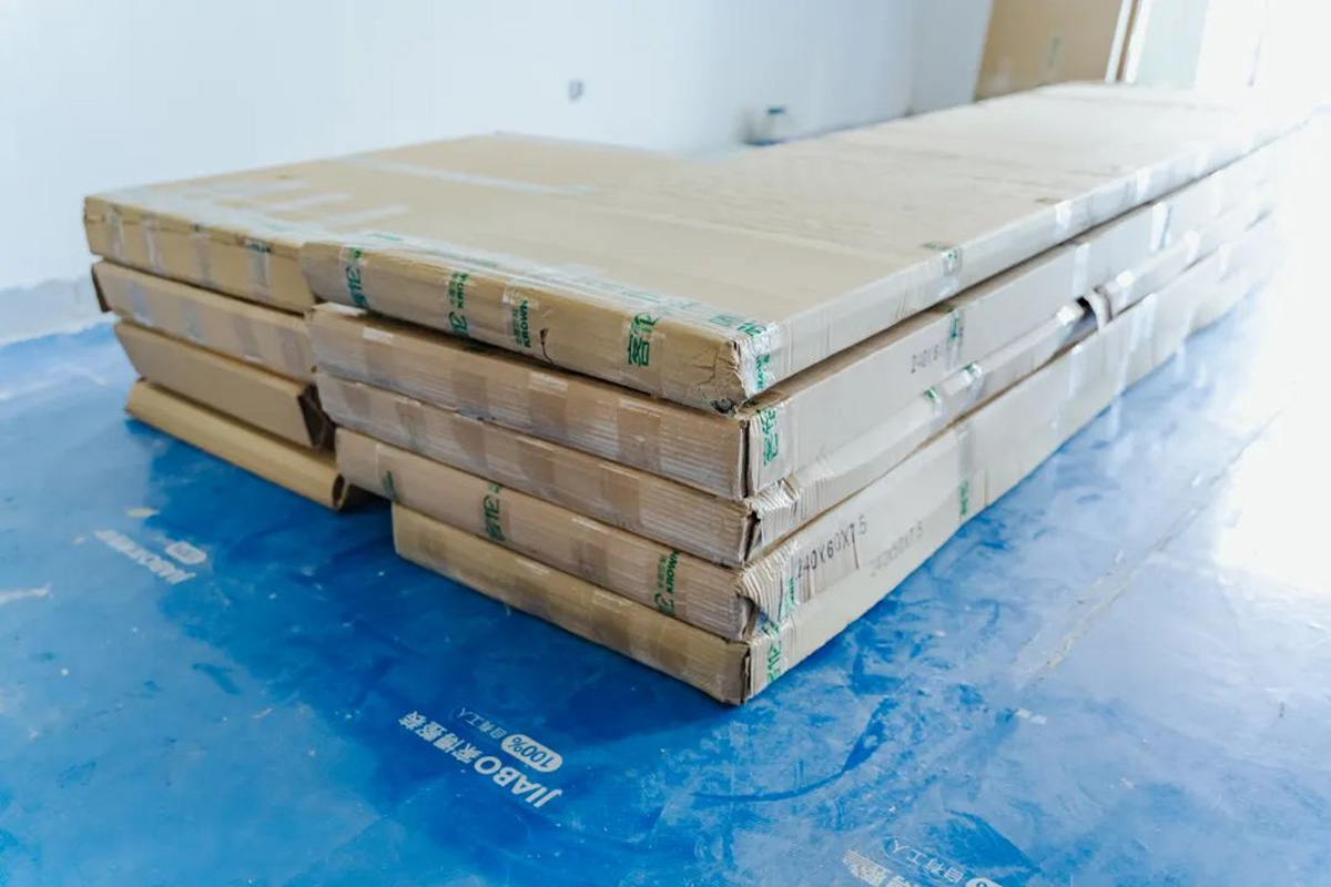 水電位置張貼警示條,后期打孔可以避開水電位置;板材并排碼放整齊,均放置在黃框內(nèi),一目了然。